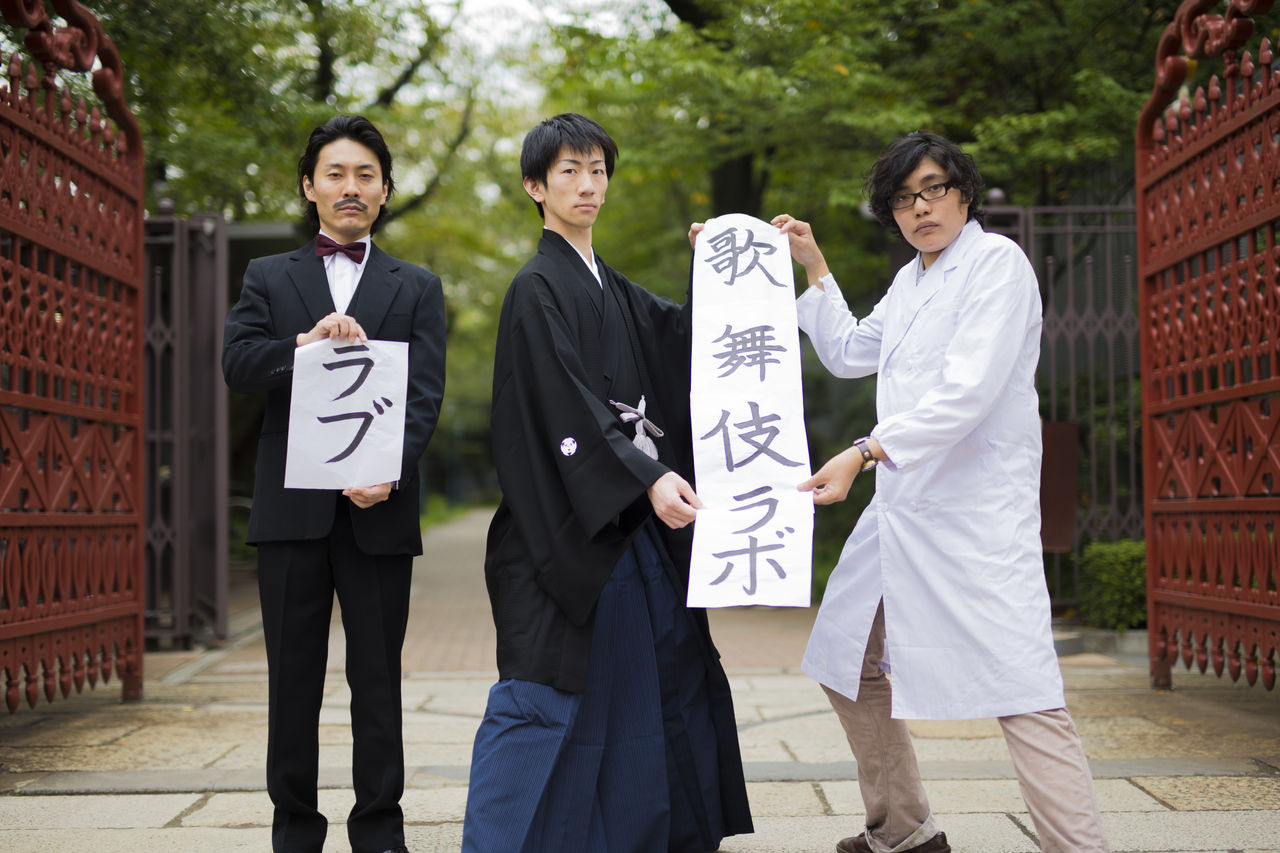 古典からコクーン歌舞伎まで、柔軟且つ真摯に取り組む新進気鋭の若手歌舞伎俳優・坂東新悟、自身が主宰する「木ノ下歌舞伎」で監修・補綴として歌舞伎の現代化を試みる木ノ下裕一、独特な風貌・世界観で老若男女を演じ分ける俳優の武谷公雄。