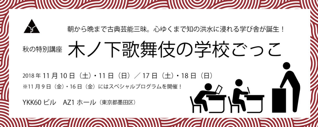秋の特別講座「木ノ下歌舞伎の学校ごっこ」の各講座チケットを販売開始いたしました。通し券、セット券は数に限りがございます。ぜひお早めにご購入ください![btn]チケットを購入する[/btn]